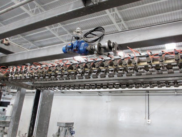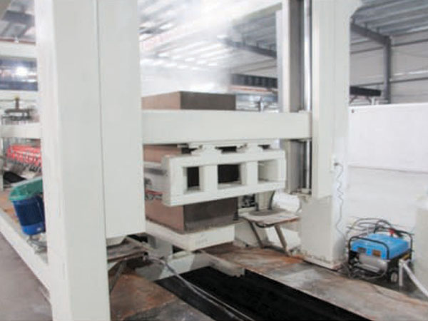 當(dāng)澆注預(yù)養(yǎng)好的模坯在空中翻轉(zhuǎn)90°吊至切割小車,脫去模框后,由一部切割小車載運(yùn)至縱切機(jī)、橫切機(jī)工位對(duì)坯體進(jìn)行六面切割。首由縱切機(jī)對(duì)坯體進(jìn)行縱向、水平四面切割,完成后由切割車載運(yùn)坯體停留在橫切機(jī)工位,完成后經(jīng)液壓升裝置上升抬起胚體,一部切割小車退回初始位置準(zhǔn)備運(yùn)載下一模胚體,以備切割。二部切割小車行至橫切機(jī)位置,液壓升裝置下降將坯體放至二部切割小車上,然后由橫切機(jī)對(duì)坯體進(jìn)行垂直切割,切割完成后仍由二部切割車運(yùn)載坯體運(yùn)行至半成品吊具下方,由半成品吊具將坯體吊到蒸養(yǎng)車上做預(yù)編組。切割周期約4. 5min.